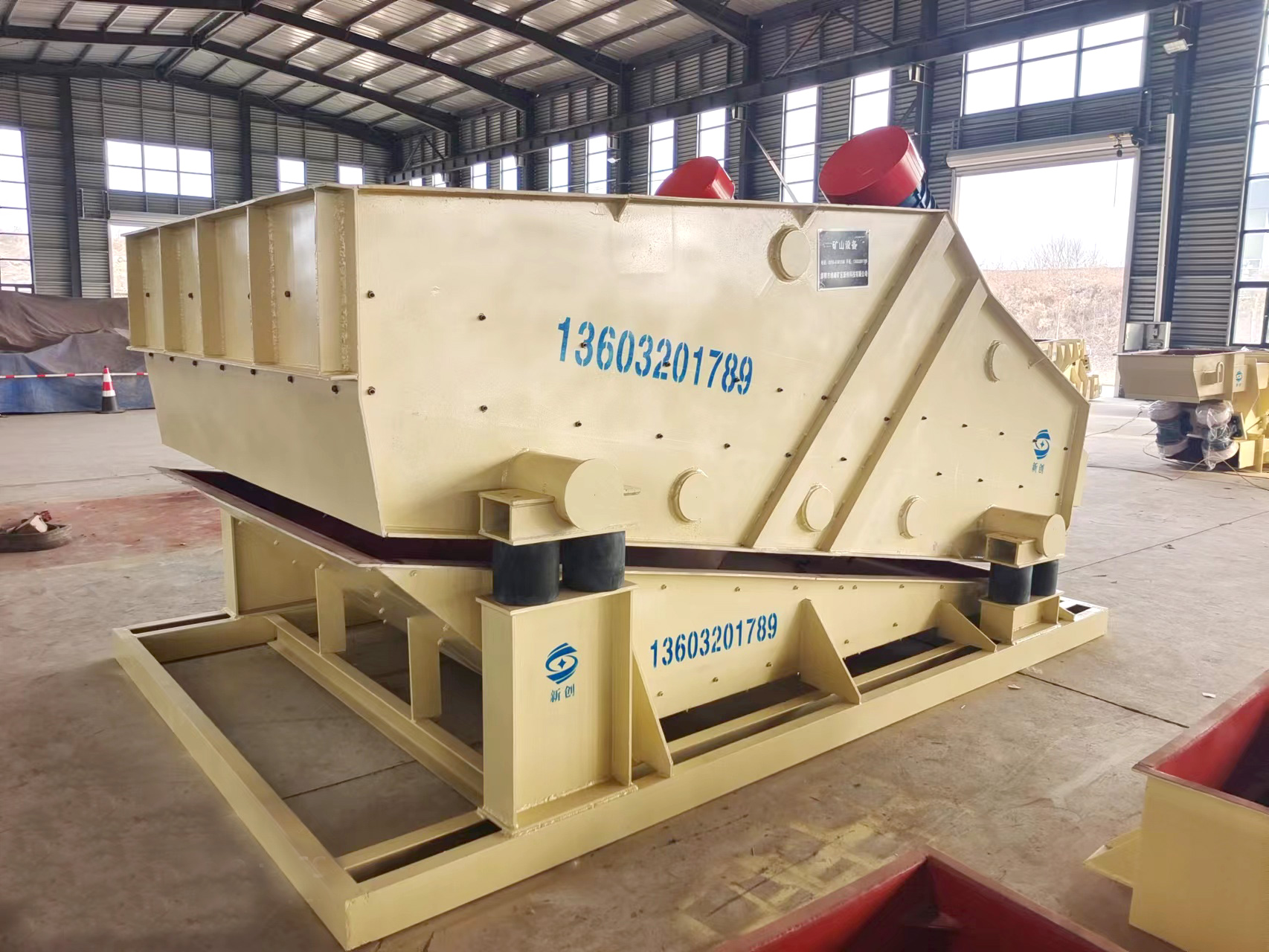 產(chǎn)品描述: 用于煤炭、水電、礦山、建材、化工、塑料、磨料、醫(yī)藥、糧食、炭素、化肥等行的設(shè)備 直線篩(直線振動(dòng)篩)利用振動(dòng)電機(jī)激振作為振動(dòng)源,使物料在篩網(wǎng)上被拋起,同時(shí)向前作直線運(yùn)動(dòng),物料從給料機(jī)均勻地進(jìn)入篩分機(jī)的進(jìn)料口,通過(guò)多層篩網(wǎng)產(chǎn)生數(shù)種規(guī)格的篩上物、篩下物、分別從各自的出口排出。具有耗能低、產(chǎn)量高、結(jié)構(gòu)簡(jiǎn)單、易維修、全封閉結(jié)構(gòu),無(wú)粉塵溢散,自動(dòng)排料,更適合于流水線作業(yè)?! 」ぷ髟怼 SG系列振動(dòng)篩工作時(shí),兩電機(jī)同步反向旋轉(zhuǎn)使激振器產(chǎn)生反向激振力,迫使篩體帶動(dòng)篩網(wǎng)做縱向運(yùn)動(dòng),使其上的物料受激振力而周期性向前拋出一個(gè)射程,從而完成物料篩分作業(yè). 直線振動(dòng)篩是雙振動(dòng)電機(jī)驅(qū)動(dòng)。當(dāng)兩臺(tái)振動(dòng)電機(jī)做同步、反缶旋轉(zhuǎn)時(shí),其偏心塊所產(chǎn)生的激振力在平行于電機(jī)軸線的方向相互抵消,在垂直于電機(jī)軸的方向疊為一合力,因此篩機(jī)的運(yùn)動(dòng)軌跡為一直線。兩電機(jī)軸相對(duì)篩面有一傾角,在激振力和物料自重力的合力作用下,物料在篩面上被拋起跳躍式向前作直線運(yùn)動(dòng),從而達(dá)到對(duì)物料進(jìn)行篩選和分級(jí)的目的。適用于粒度在0.074-5mm、含水量小于70%、無(wú)粘性的各種干式粉狀物料的篩分。給料粒度不大于10mm?! ZSF直線振動(dòng)篩主要特點(diǎn)及適于行業(yè): 篩分精度高、處理量大、結(jié)構(gòu)簡(jiǎn)單、耗能少、噪音低、篩網(wǎng)使用壽命長(zhǎng)、密封性好、極少粉塵溢散、維修方便、可用于流水線生產(chǎn)中的自動(dòng)化作業(yè)。 廣泛應(yīng)用于化工、食品、塑料、醫(yī)藥、冶金、玻璃、建材、糧食、化肥、磨料、陶瓷等行業(yè)中干式粉狀或顆粒狀物料的篩分?! 』咎攸c(diǎn) 穩(wěn)定可靠、消耗少、噪音低、壽命長(zhǎng)、振型穩(wěn)、篩分效率高等?! ZSF直線振動(dòng)篩主要特點(diǎn): 1、密封性好、極少粉塵溢散?! ?、耗能少、噪音低、篩網(wǎng)使用壽命長(zhǎng)?! ?、篩分精度高、處理量大、結(jié)構(gòu)簡(jiǎn)單?! ?、全封閉結(jié)構(gòu)、自動(dòng)排料、更適合于流水線作業(yè)。 5、篩體各部分均采用扎制鋼板及型材焊接而成(部分組體間為螺栓連接)整體剛度好,牢固可靠。